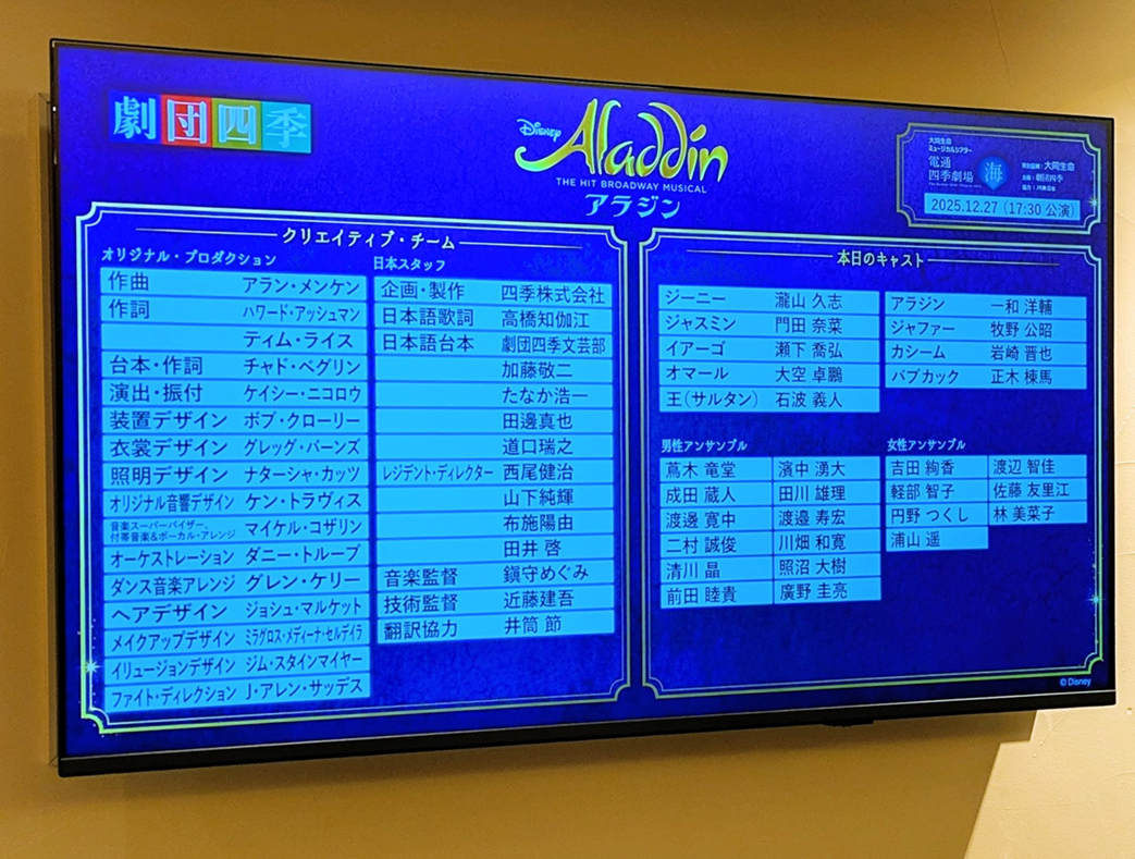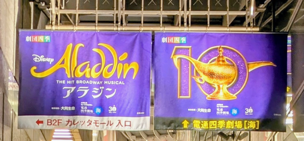 今年は「アラジン」を見に行きました。ライオンキング同様、恒常的にロングラン公演してくれている作品ですね。