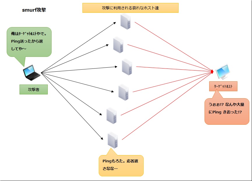 攻撃者がpingの発信元アドレスを攻撃したいホスト(ターゲットホスト)のIPアドレスに変更していろんなホストに